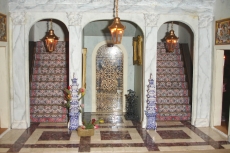 De entreehal met dubbele trap en doorkijk (gietijzeren deur) naar achtertuin. Met echte porseleinen tulpenvazen voor de bogenwand.Uniek Poppenhuis:
